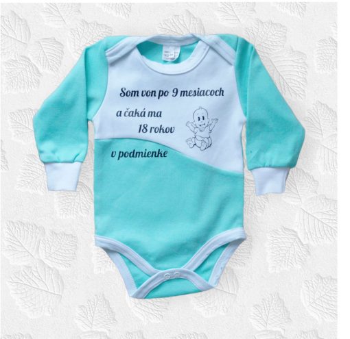 Originálne detské body s dlhým rukávom, veľmi príjemné na dotyk. Kojenecké body sú vyrobené na Slovensku zo 100 % bavlny (210-220 g/m2}. Body s nápisom majú zapínanie na cvoky na ramienku bábätka a medzi nožičkami. Veľkosť 50 – 98
